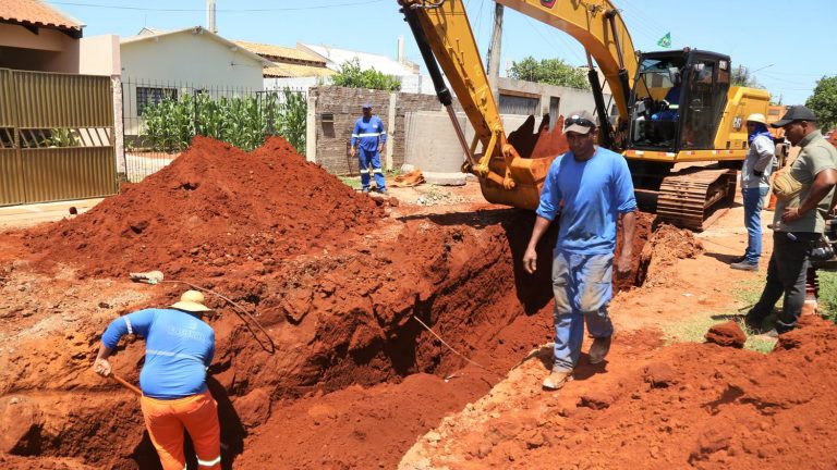 O serviço começou com abertura de valetas de 4 metros de profundidade para o assentamento de tubos de até 1,5 metro de diâmetro.
