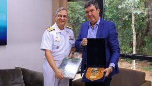 Na tarde desta segunda-feira (22), o governador Eduardo Riedel recebeu na Governadoria o almirante de Esquadra José Augusto Vieira da Cunha de Menezes,