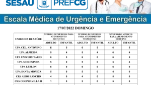 Confira a escala médica de plantão nas UPAs e CRSs neste domingo, dia 17 de julho de 2022.
