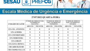 Confira a escala médica de plantão nas UPAs e CRSs nesta quarta-feira, dia 27 de julho de 2022.